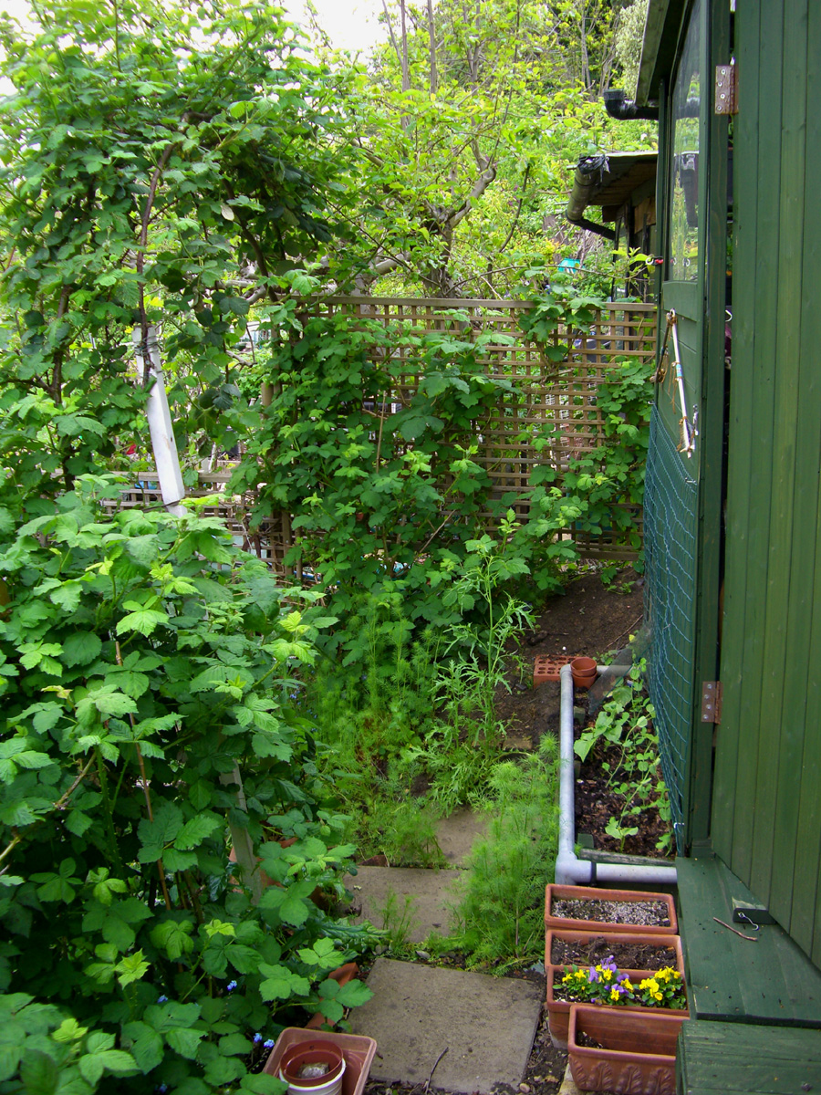 Spring shed with peppers and tomatoes. (early May 2021)Bottom of the strawberry stairs. (May 2021)Strawberries across from raspberry bed, and new brick path. (May 2021)New lettuce & broccoli beds, with over-wintered garlic beds going strong & Felicity Fiacra keeping watch. Pea bed planted up at top of the stairs. (Early May 2021)