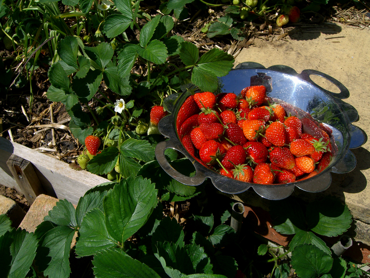 So the sun is out – hot and 26 degrees. Felt hotter in the full sun working hard pulling weeds! Arrived in the morning after a nice breakfast on a terrace in south Hampstead, and once we finally wound our way into the site and onto our little plot we were amazed to find that our strawberry patch is ready to harvest! Had a fair-sized collection from the early ripeners. So tonight’s going to be strawberry and rhubarb crumble. Yum!