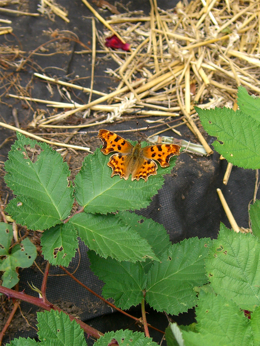 But this little butterfly is surely loving life on the allotment. We think it’s a Comma Butterfly, and looks very handsome and striking sitting on this blackberry leaf.