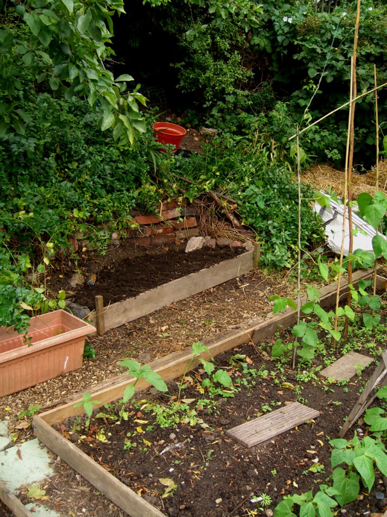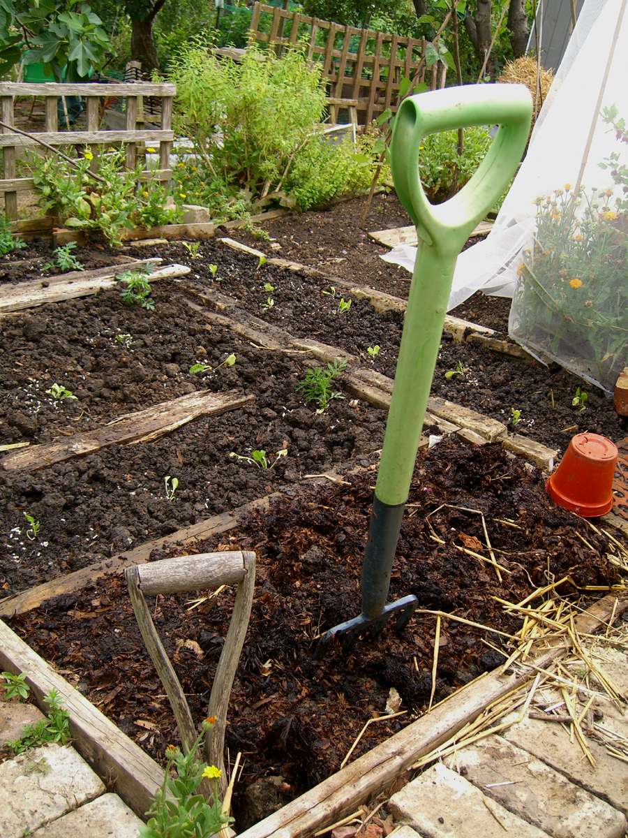 The front narrow bed top-dressed with manure with the fork in it in the photo here is still unplanted. So there’s more to come in our beloved little allotment.
