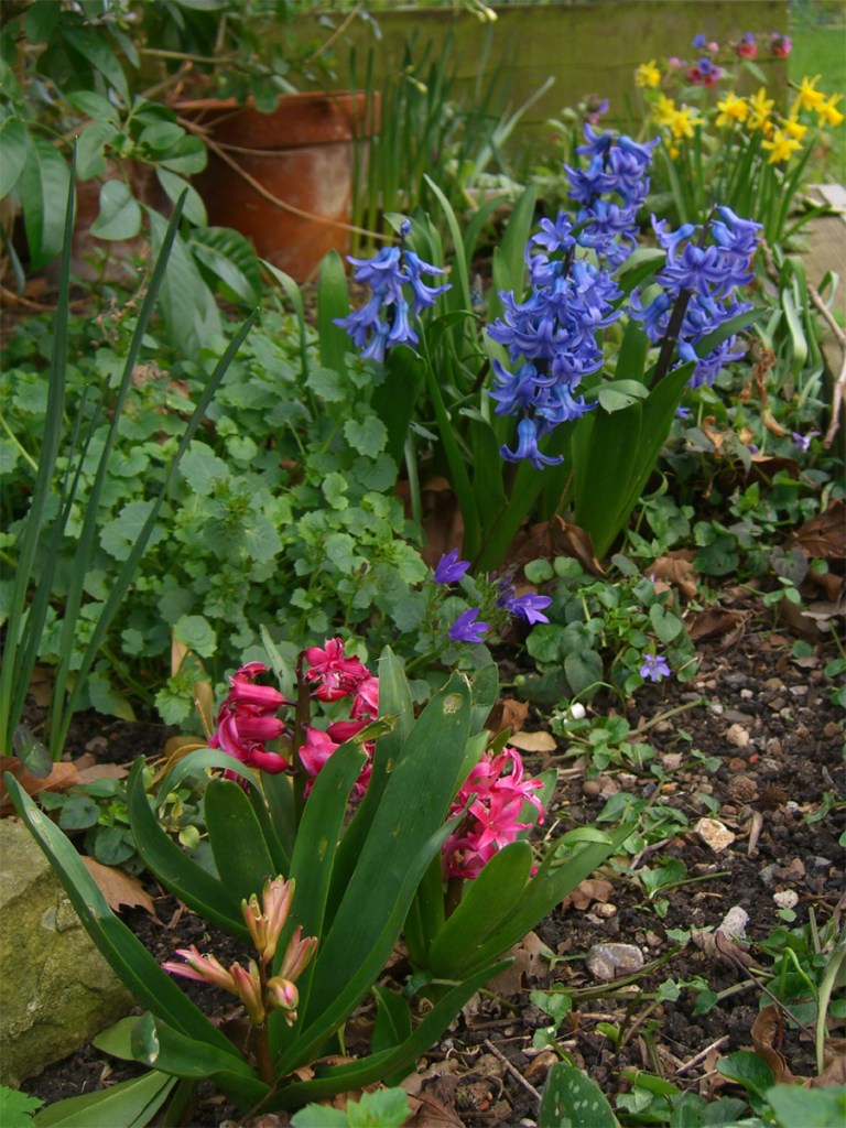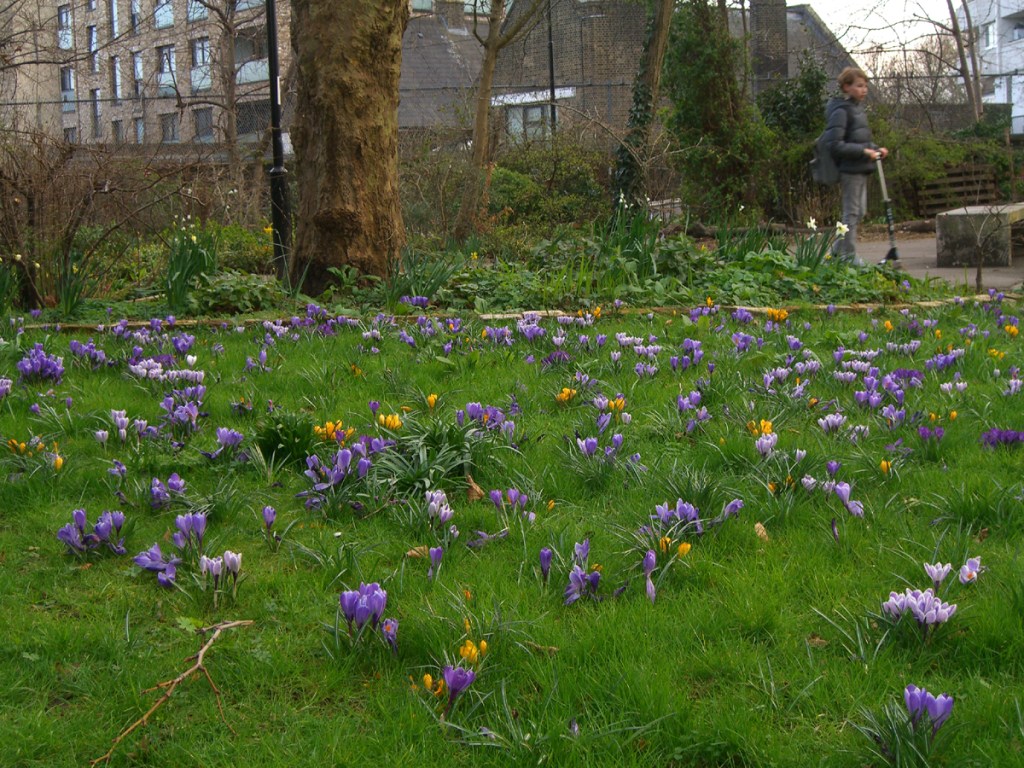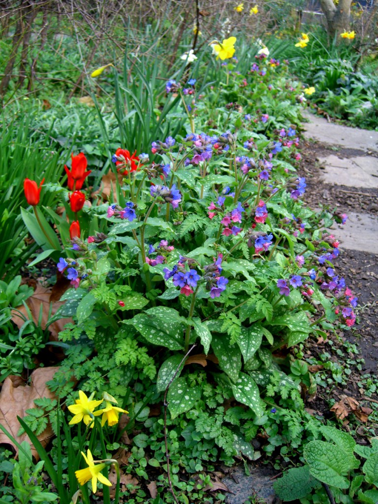 Enfin! At long last, emerging from the funk of winter. Spring has been with us since January – with the annual appearance of snowdrop. But this year things are a bit screwy, shall we say. We’ve had crocus very early in February, along with daffodil. Wood violet are in flower and have been for at least a few weeks, and lungwort is also in bloom, as are the meadow planted vinca with their pretty open faced blue flowers. The primrose in the half circle bed have come and largely gone – they were flowering since January! Tulips are out by late February/ early March. The climate’s gone a bit bonkers to be fair. London still has frost alerts at night but day temperatures can be balmy in the teens.